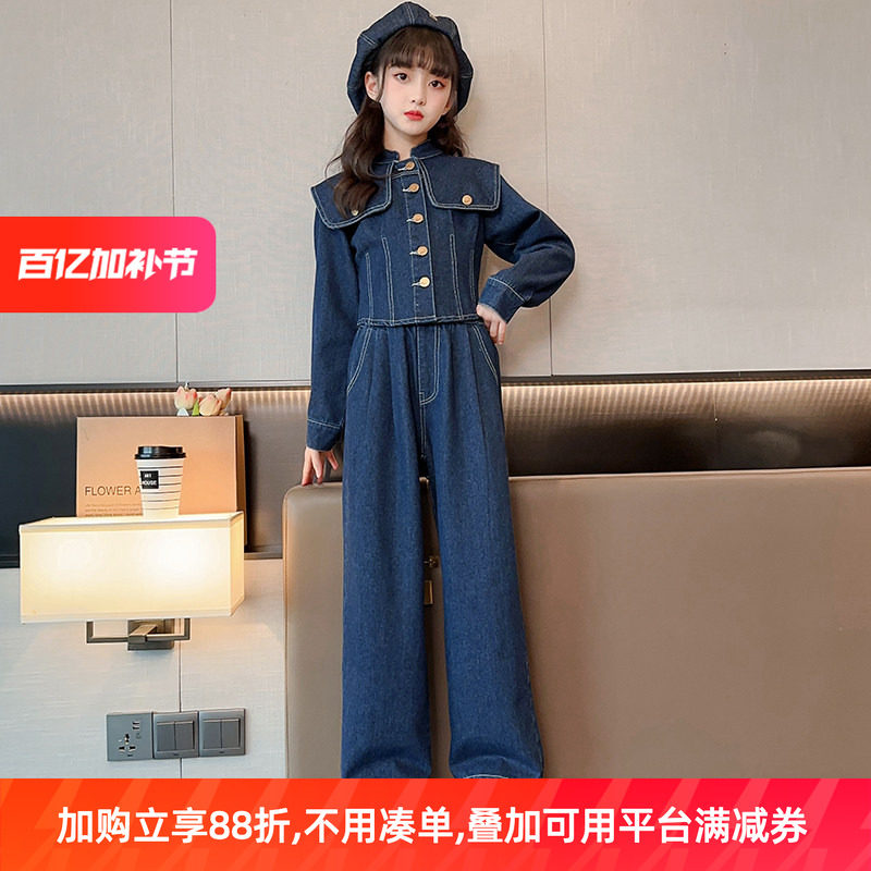 女大童春秋装牛仔套装2026新款儿童洋气炸街韩版工装阔腿裤两件套