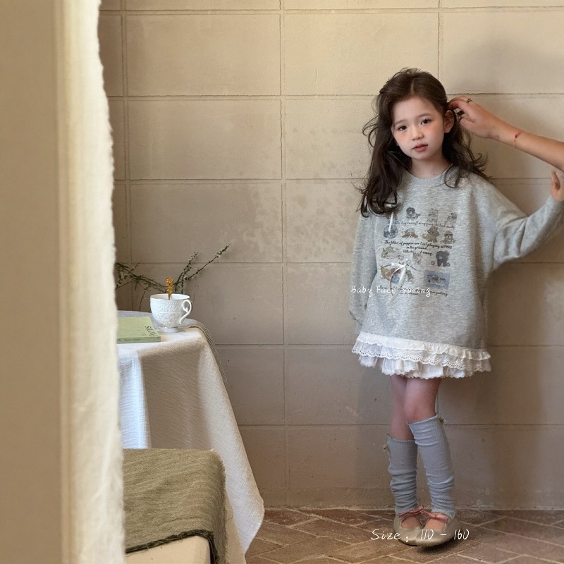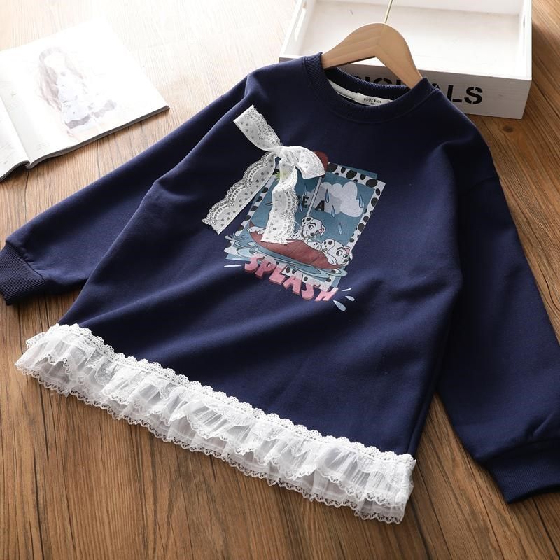韩版女童中长款春季卫衣2025新款圆领印花蕾丝边长袖宽松套头上衣
