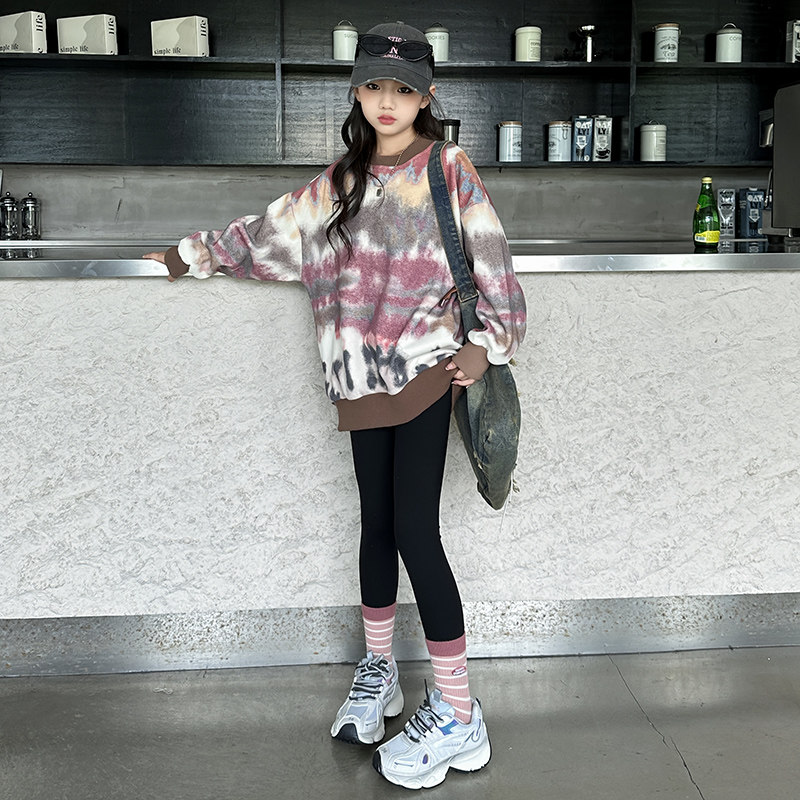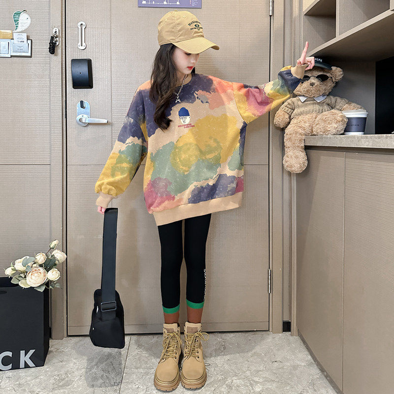 女童扎染卫衣春秋装2024新款女大童宽松中长款韩版包臀洋气上衣潮