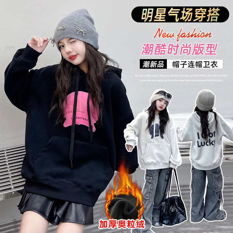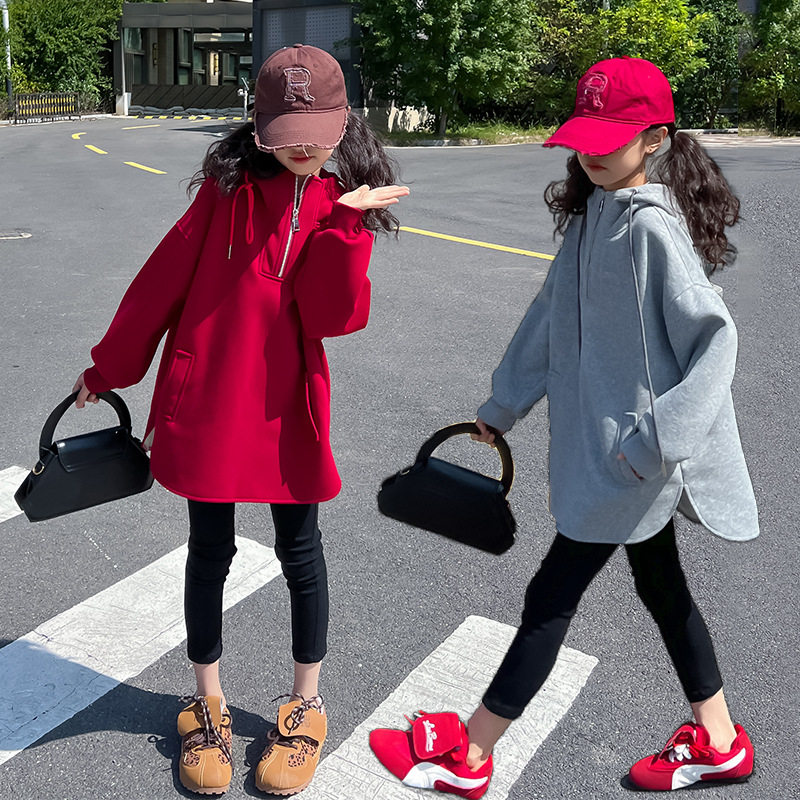 2024秋冬新款童装甜酷女童韩版中长款洋气时髦长袖加绒卫衣上衣