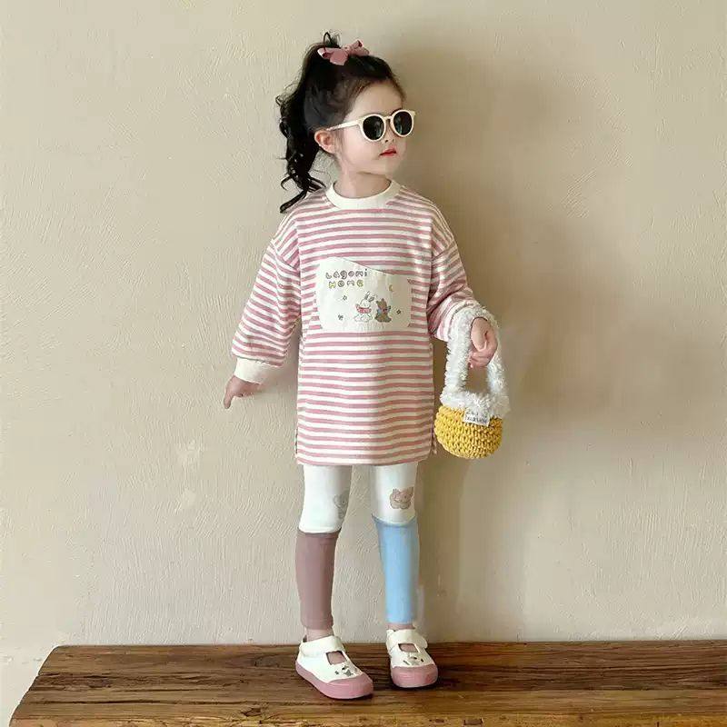 女童条纹中长款卫衣裙2025秋季新款韩版女宝洋气卡通贴布连衣裙潮