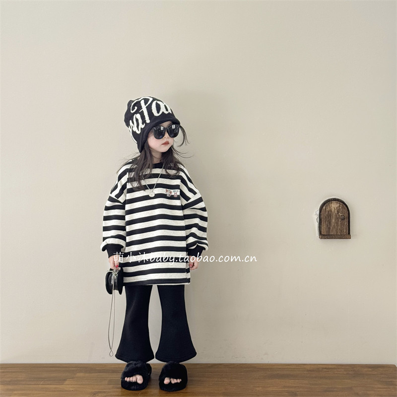 儿童洋气厚款卫衣2025新款韩版女童冬季加绒中长款宽松条纹套头衫