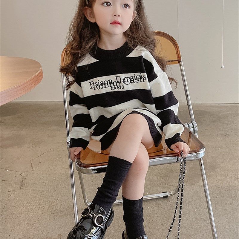女童洋气条纹卫衣裙2023春秋新款韩版儿童中长款套头衫宝宝上衣潮