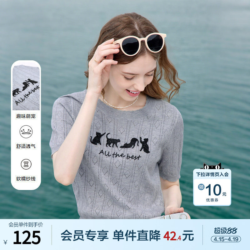 betu百图灰色趣味萌宠线衣女短袖2025年夏季新款短款圆领针织衫