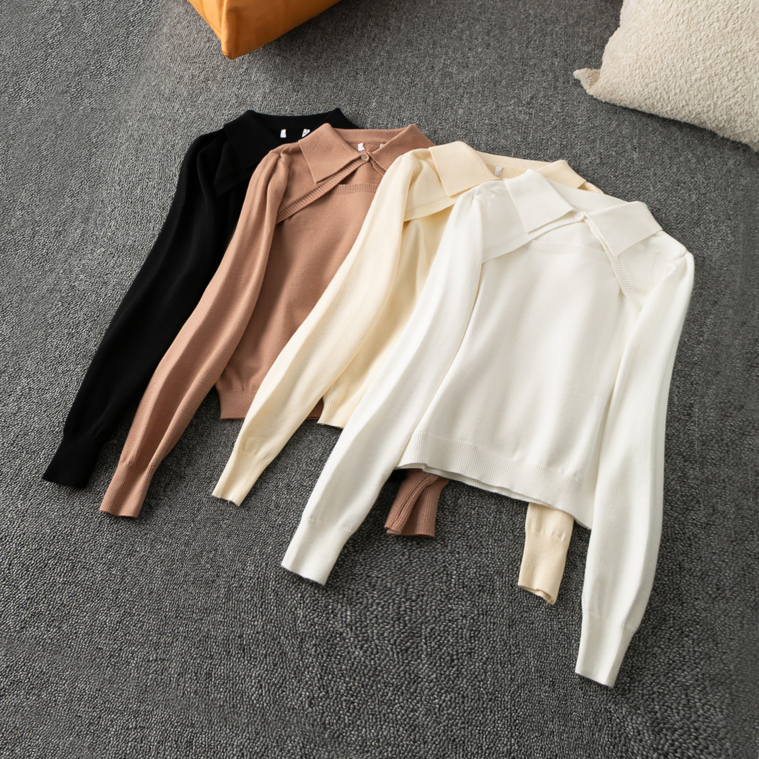 春秋外贸韩版新款 时尚气质 减龄 短款翻领长袖套头针织毛线衣