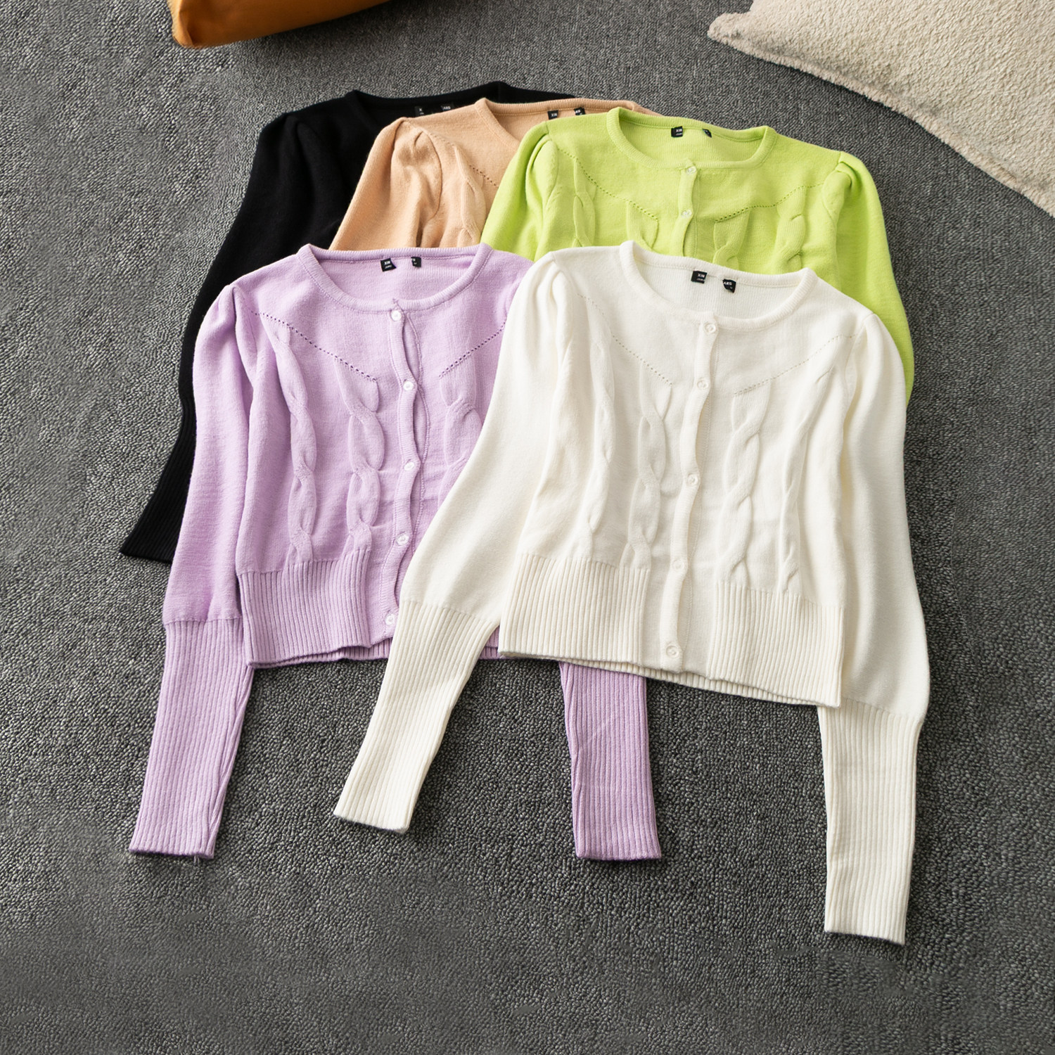 春秋外贸韩版新款 舒适保暖 时尚简约 短款圆领长袖单排扣毛线衣