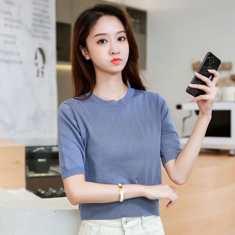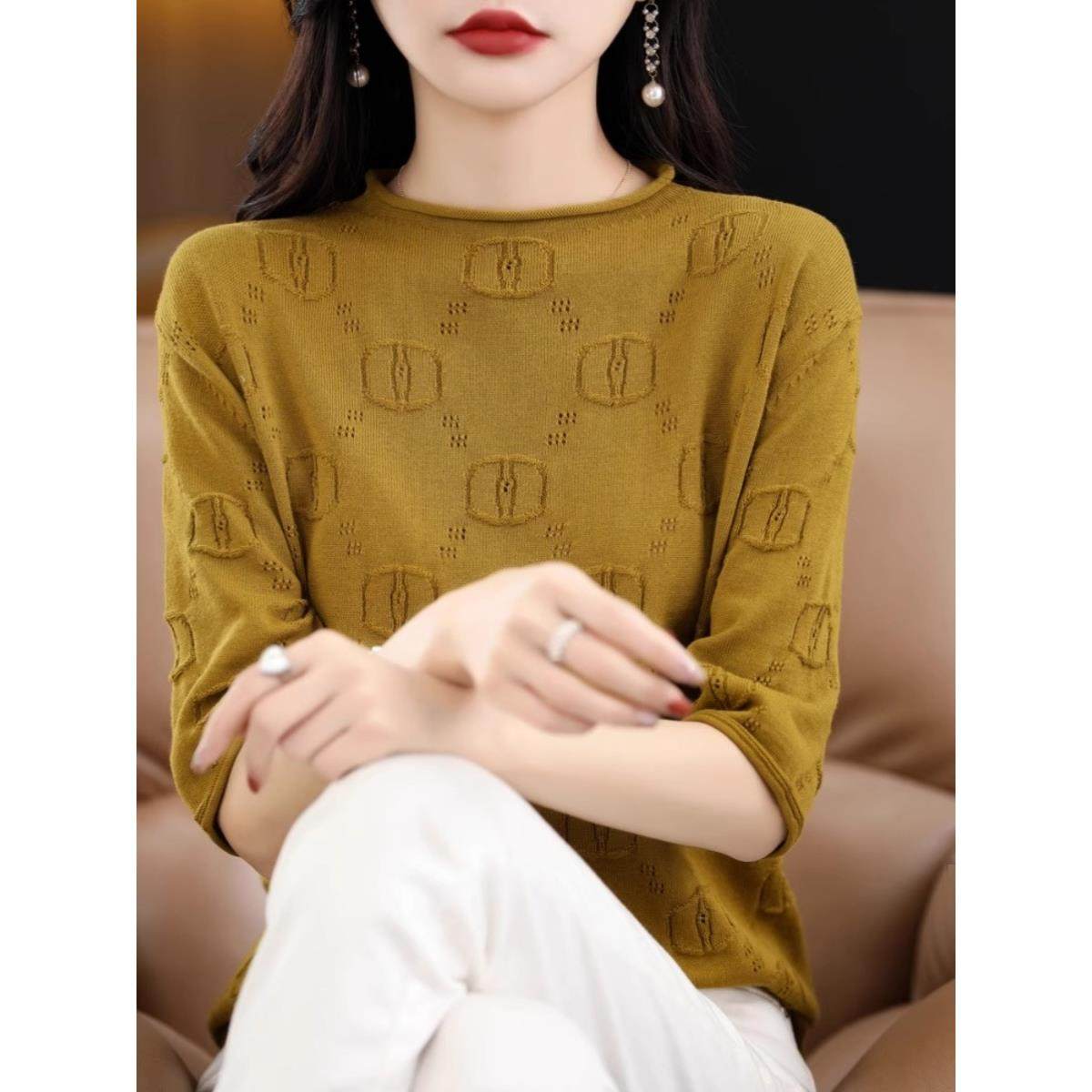 100纯棉线五分袖针织衫女夏薄半高卷边领短款线衣宽松中袖打底衫