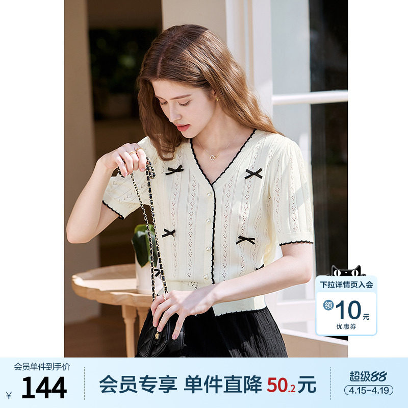 betu百图小香风立体蝴蝶结V领针织衫女2025年夏季新款短款线衣