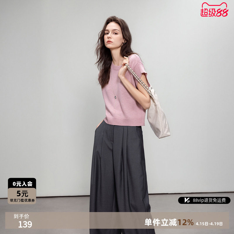 23区日系春季通勤宽松棉混纺圆领套头短款针织衫编织线衣商场同款