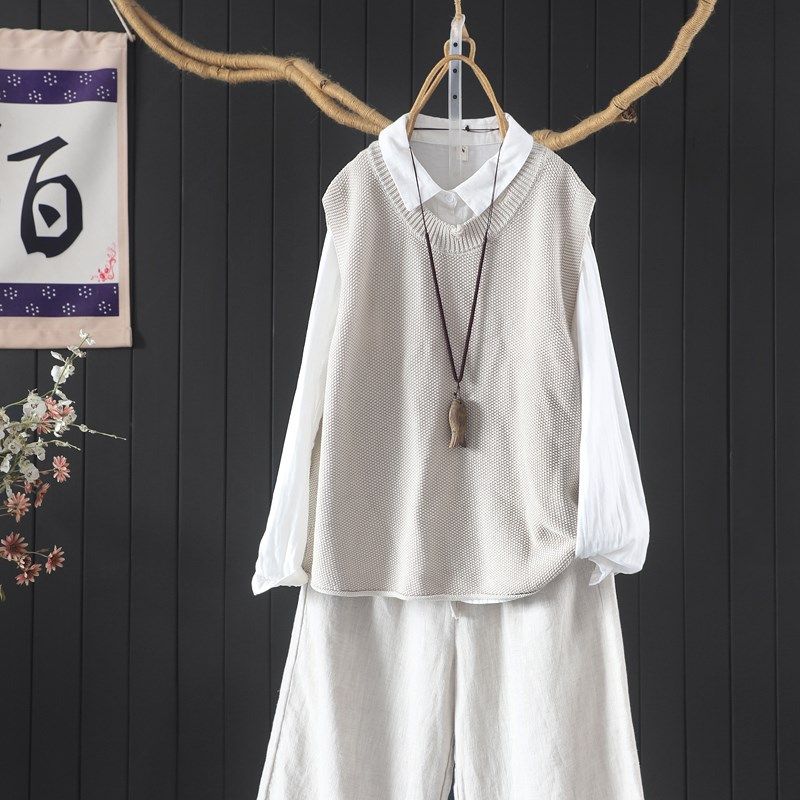 文艺百搭无袖毛衣2024年春x装宽松纯色短款圆领套头简约线衫马甲