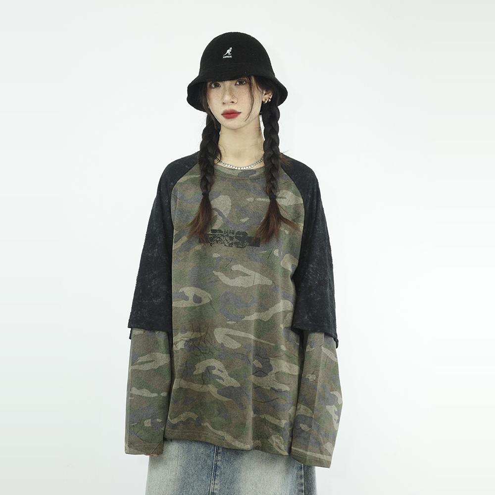 梁拌泡菜LBPC美式复古迷彩假两件长袖T恤休闲百搭街头风圆领上衣