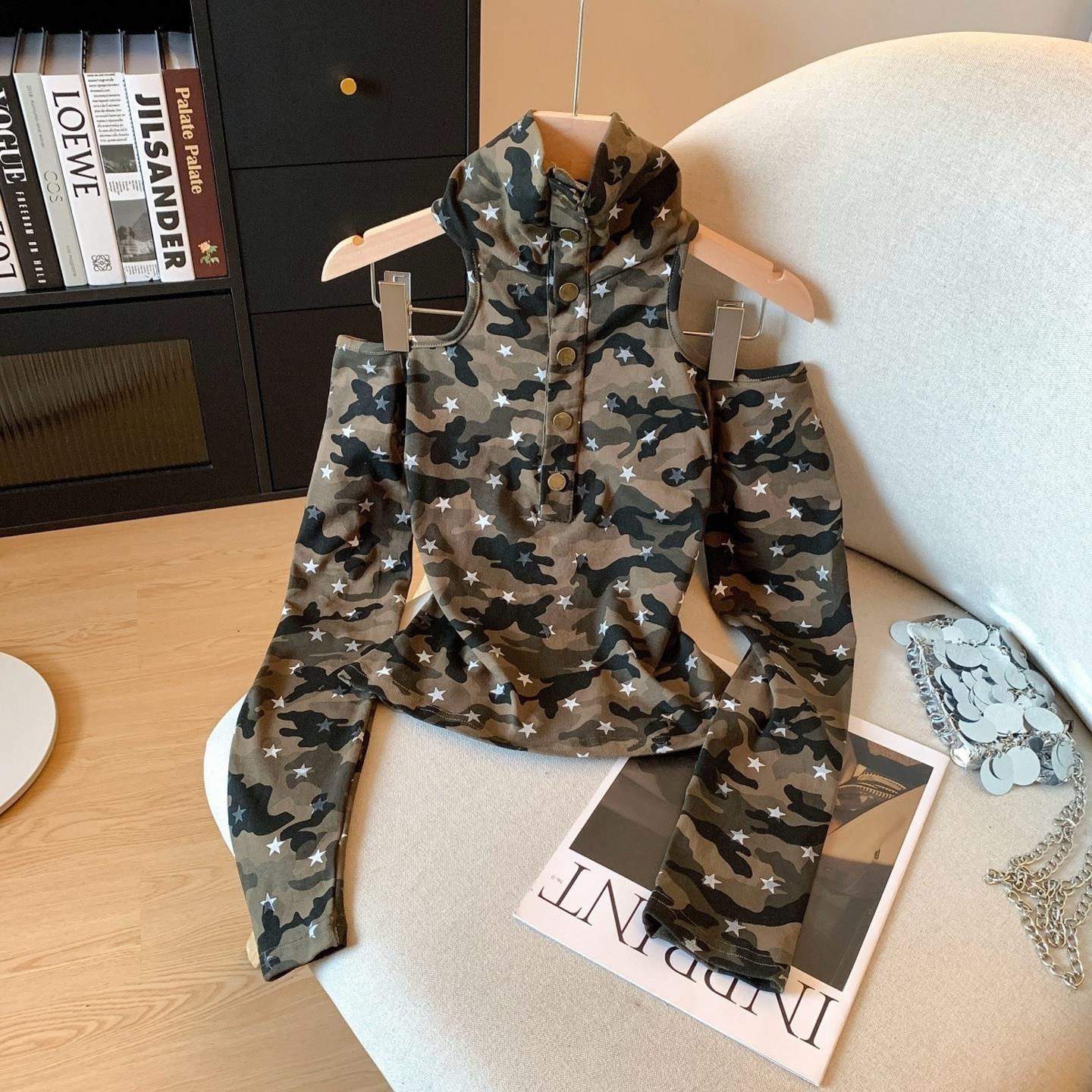 美式复古立领迷彩长袖t恤女装秋季辣妹性感露肩小个子上衣打底衫