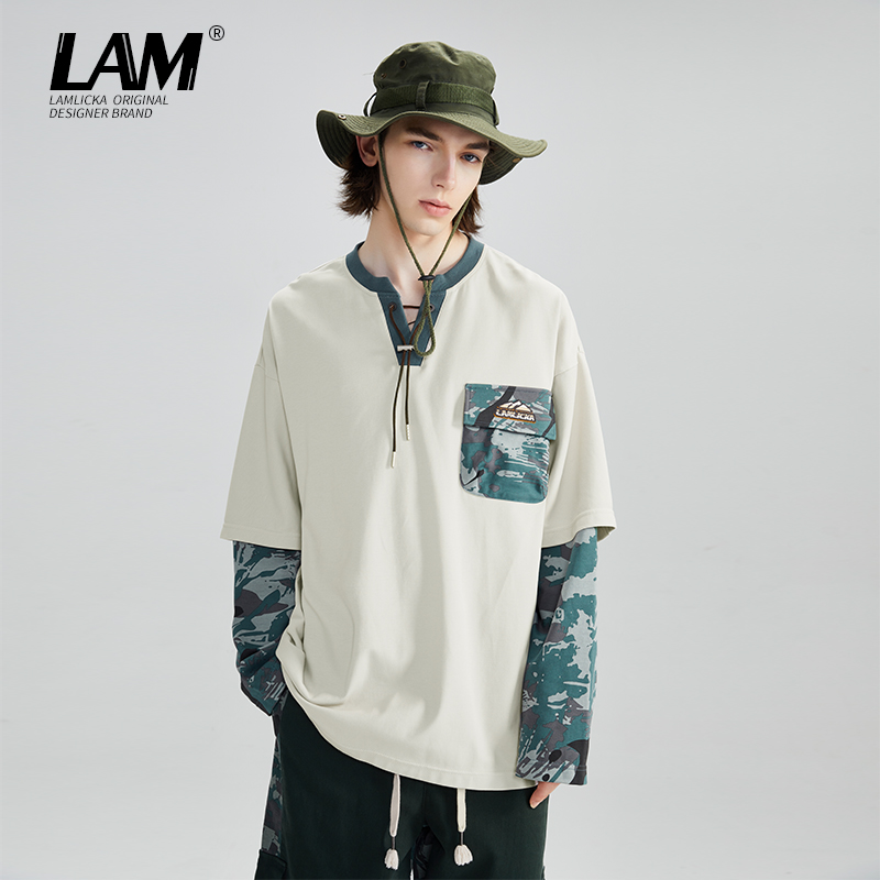 LAMLICKA假两件迷彩拼接长袖T恤男ins潮嘻哈高街oversize休闲上衣