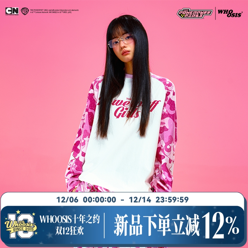 【飞天小女警联名】WHOOSIS 迷彩插肩长袖T恤美式街头潮宽松男女
