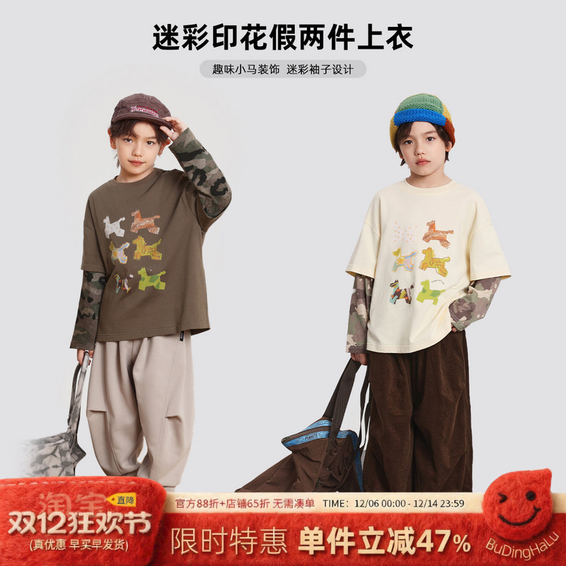 布丁哈鲁童装秋装男童假两件上衣2025春秋新款儿童潮迷彩长袖T恤