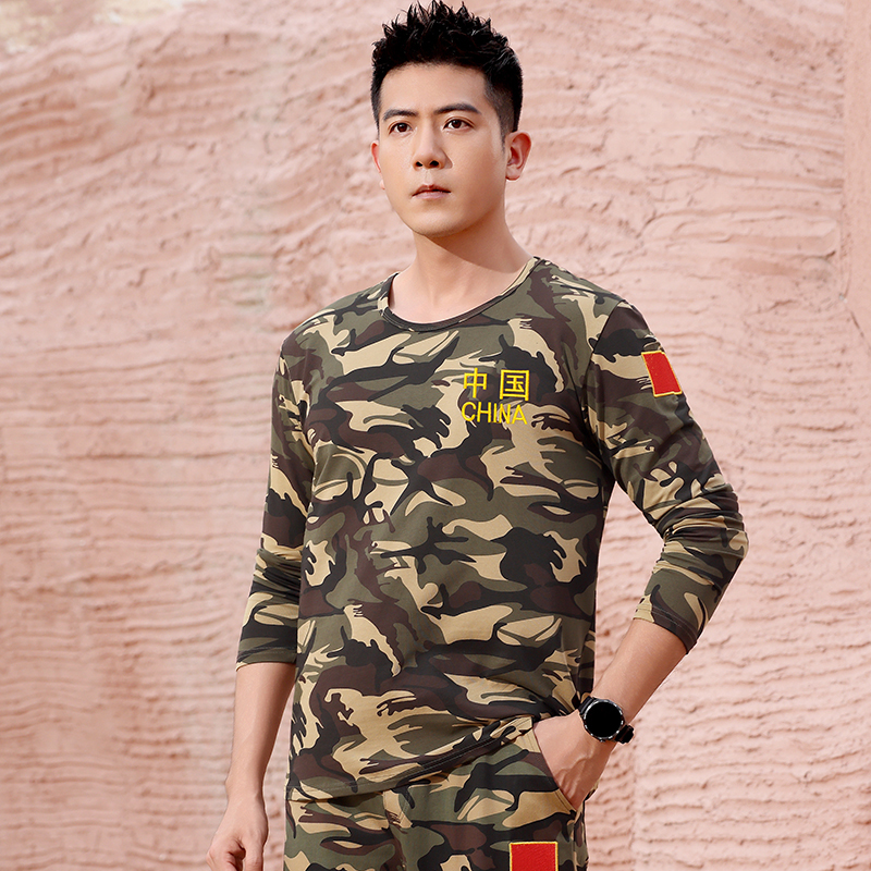 迷彩长袖t恤加大码男春秋95%棉宽松剌绣中国红旗休闲迷彩服打底衫