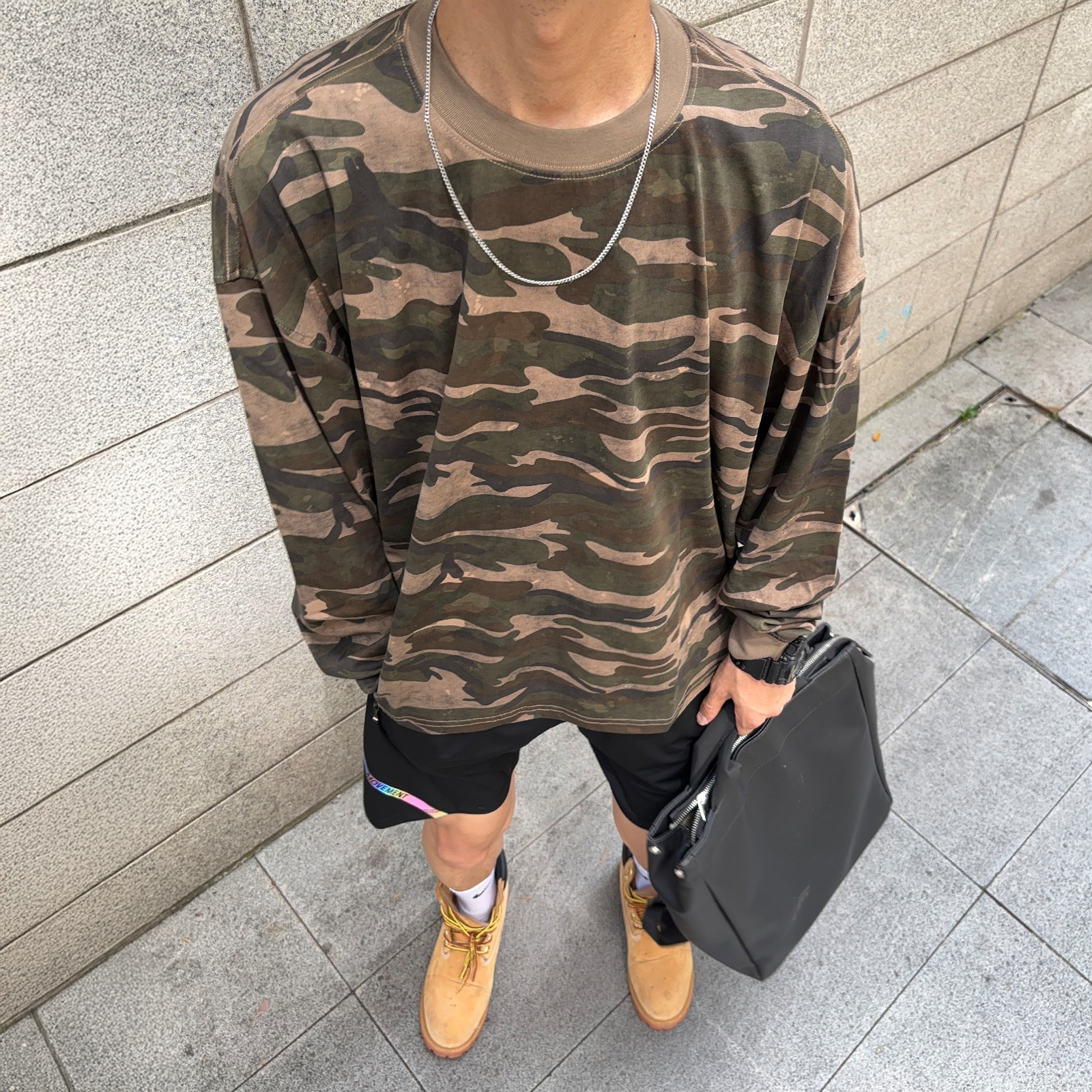 美式潮牌boxy宽短版迷彩长袖T恤男街头休闲慵懒风圆领打底衫上衣