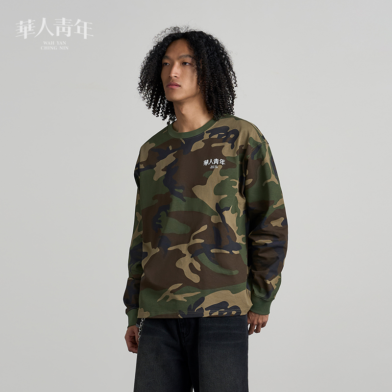 华人青年迷彩长袖T恤打底衫男潮牌复古宽松休闲基础百搭情侣上衣