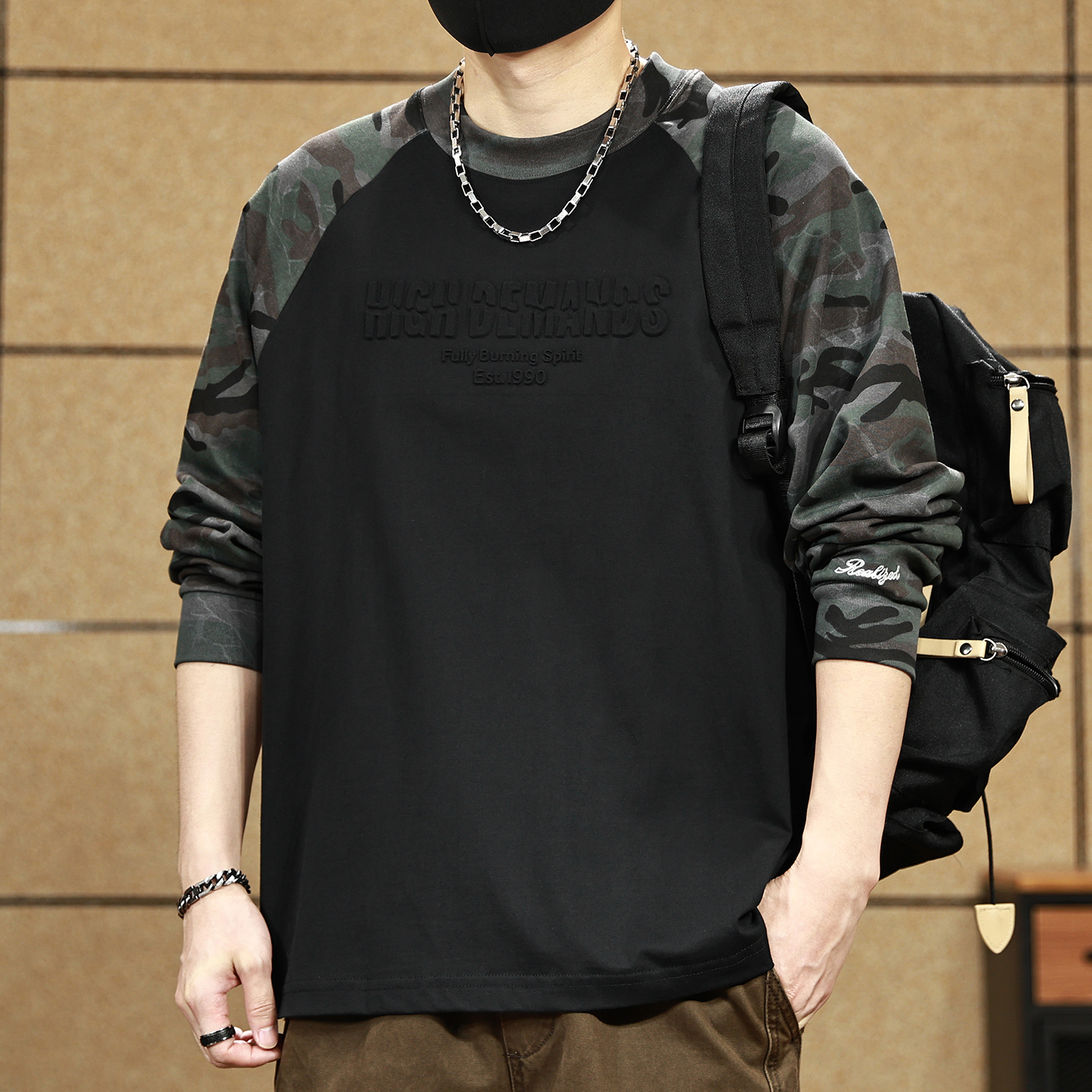 美式潮牌纯棉男士长袖T恤春秋宽松迷彩撞色印花圆领大码内搭卫衣
