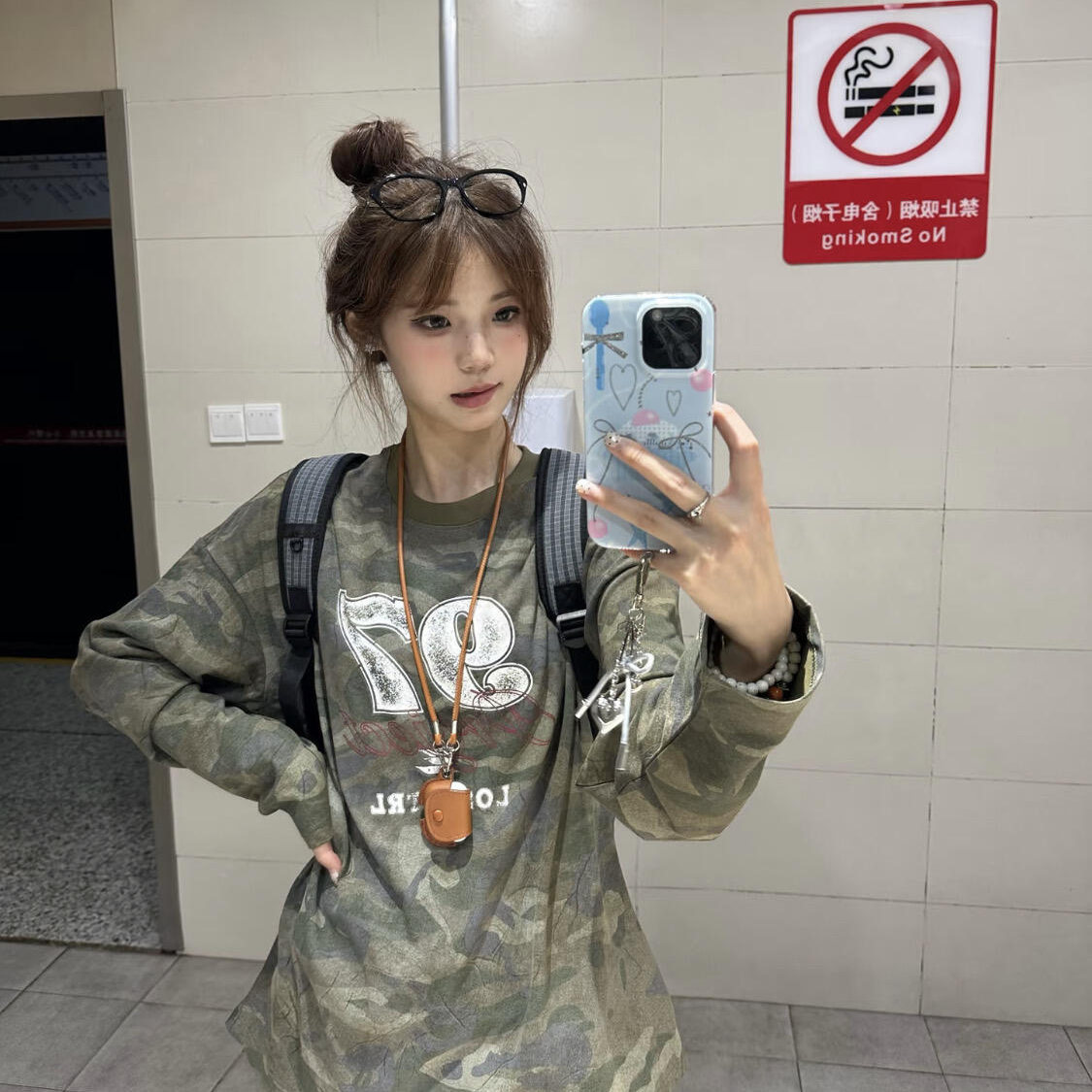 美式复古印花迷彩长袖T恤女春秋新款慵懒宽松休闲圆领情侣款上衣