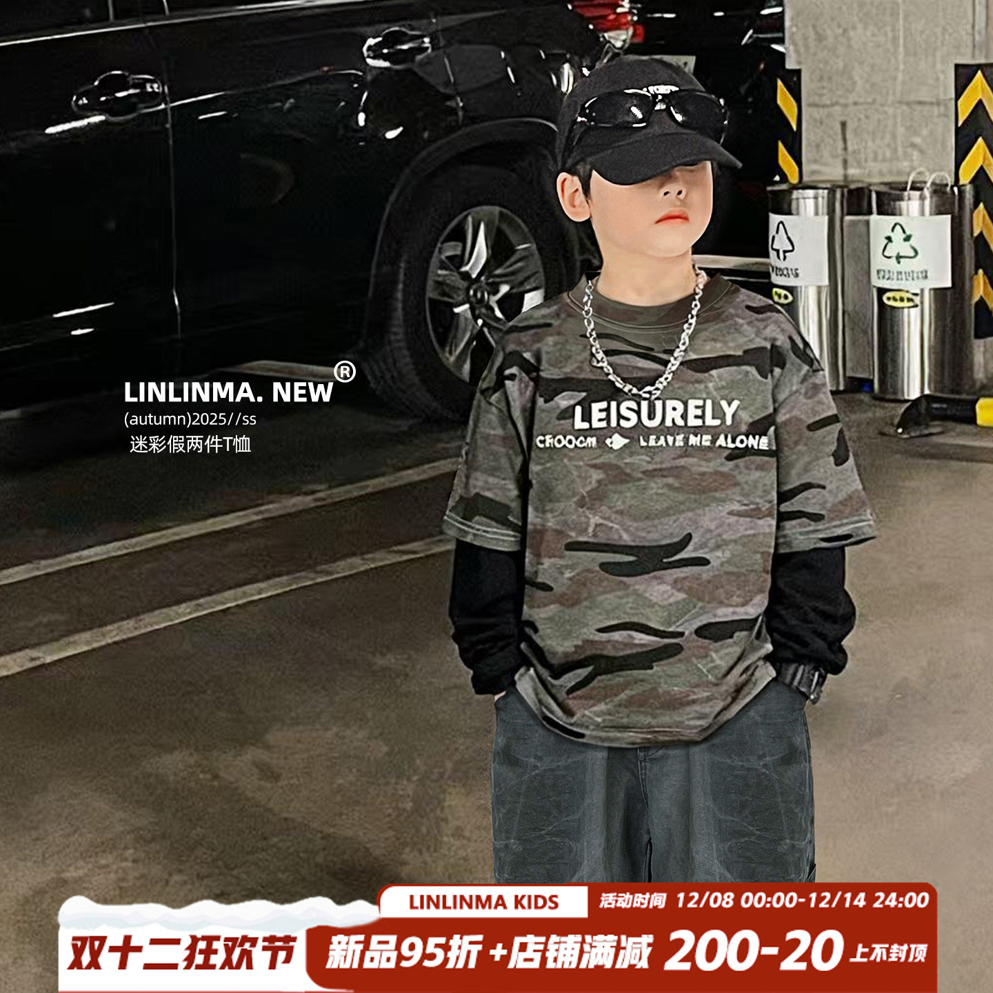 霖霖妈童装儿童假两件上衣秋男童迷彩长袖T恤秋装潮牌中大童衣服