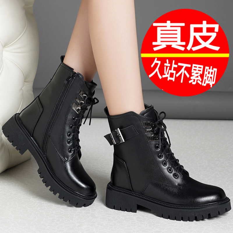 超软头层牛皮马丁靴女平底2025年新款中筒靴子女坡跟厚底加绒棉靴