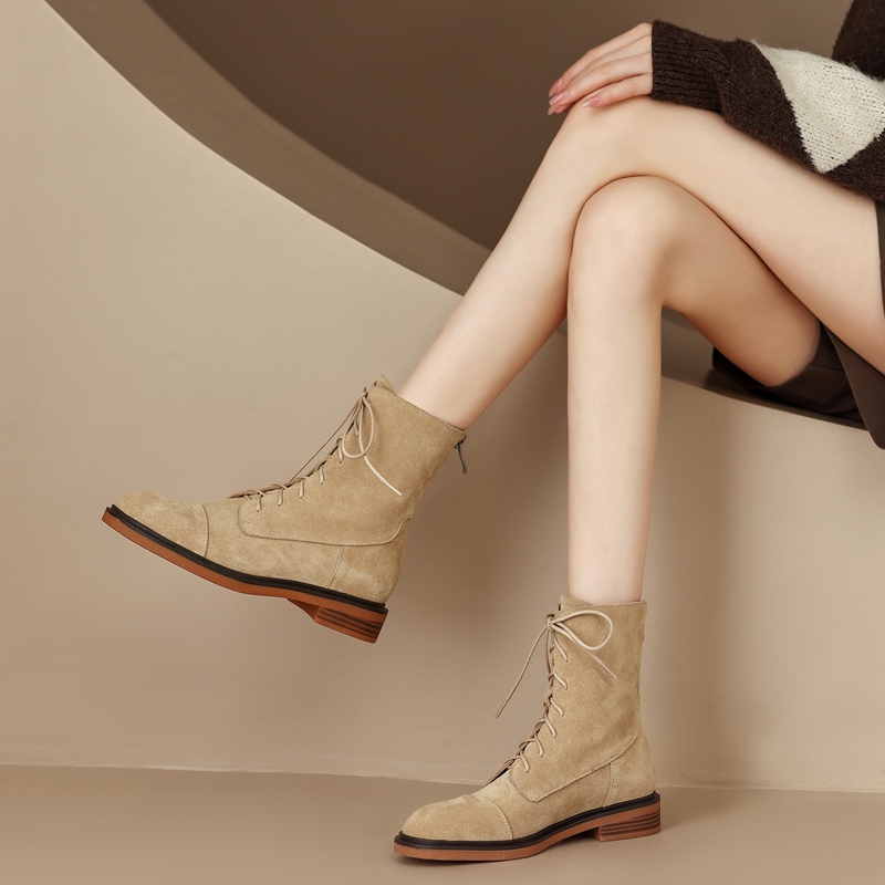 小婉手工头层牛皮休闲复古马丁靴女平底低跟舒适百搭系带秋冬棉靴