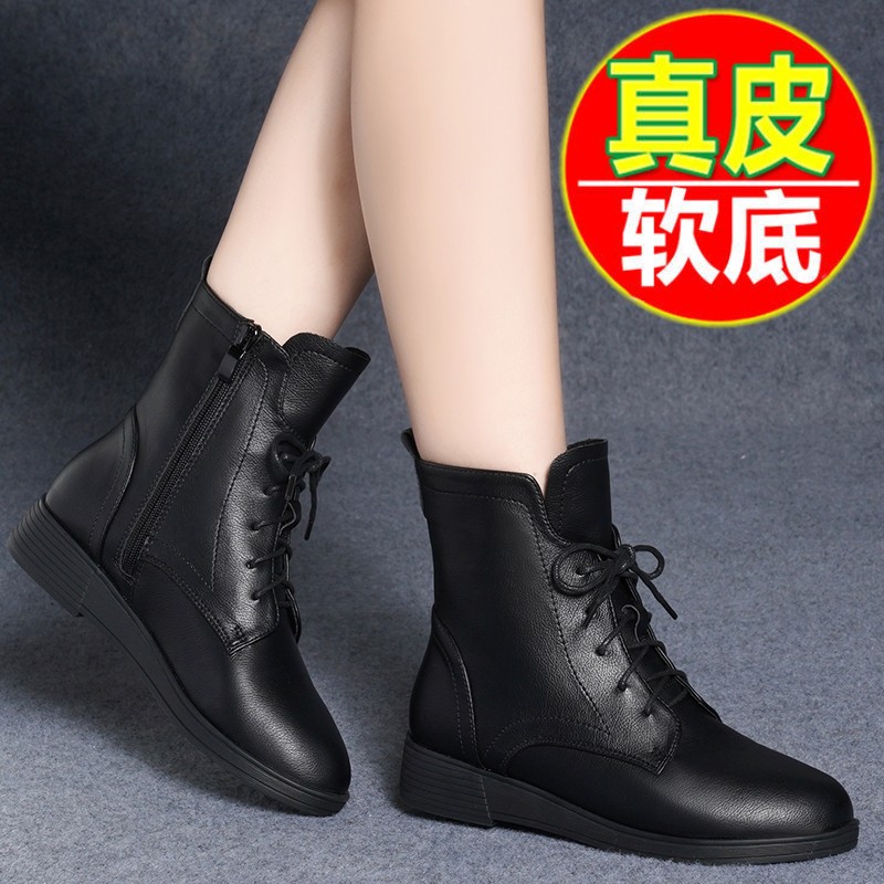 头层牛皮冬季加绒马丁靴女短靴系带软底舒适平底妈妈鞋切尔西单靴