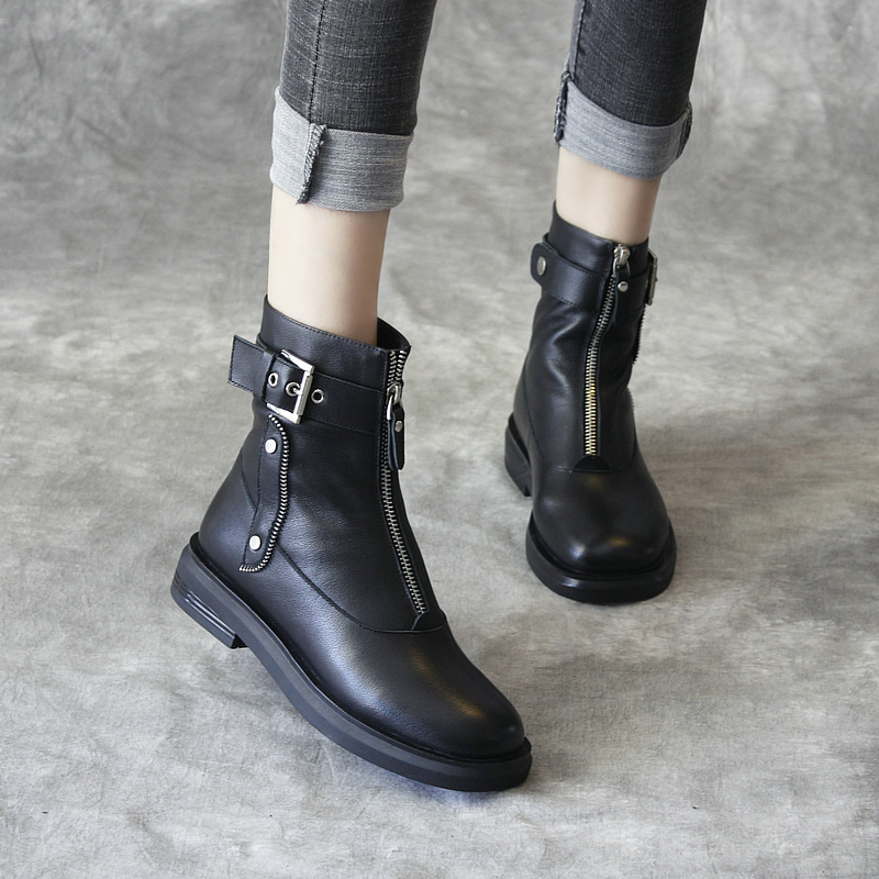 女靴春秋单靴2025新款真皮前拉链马丁靴女平底牛皮短靴圆头铆钉靴