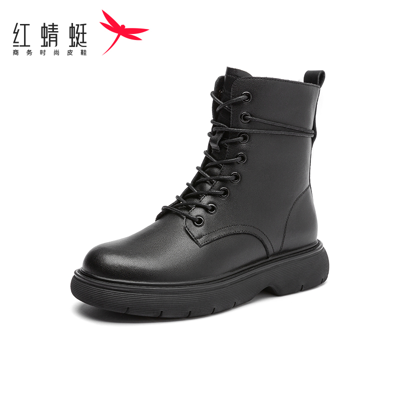 紅蜻蜓女鞋断码清仓蜻短靴女秋冬新款马丁靴女平底靴加绒牛皮黑色