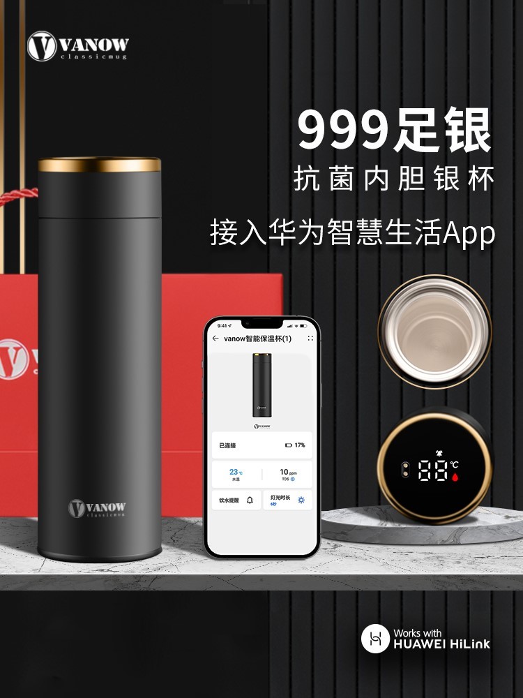 英国Vanow智能纯银保温杯正品999银水杯子男高档银内胆保健泡茶杯