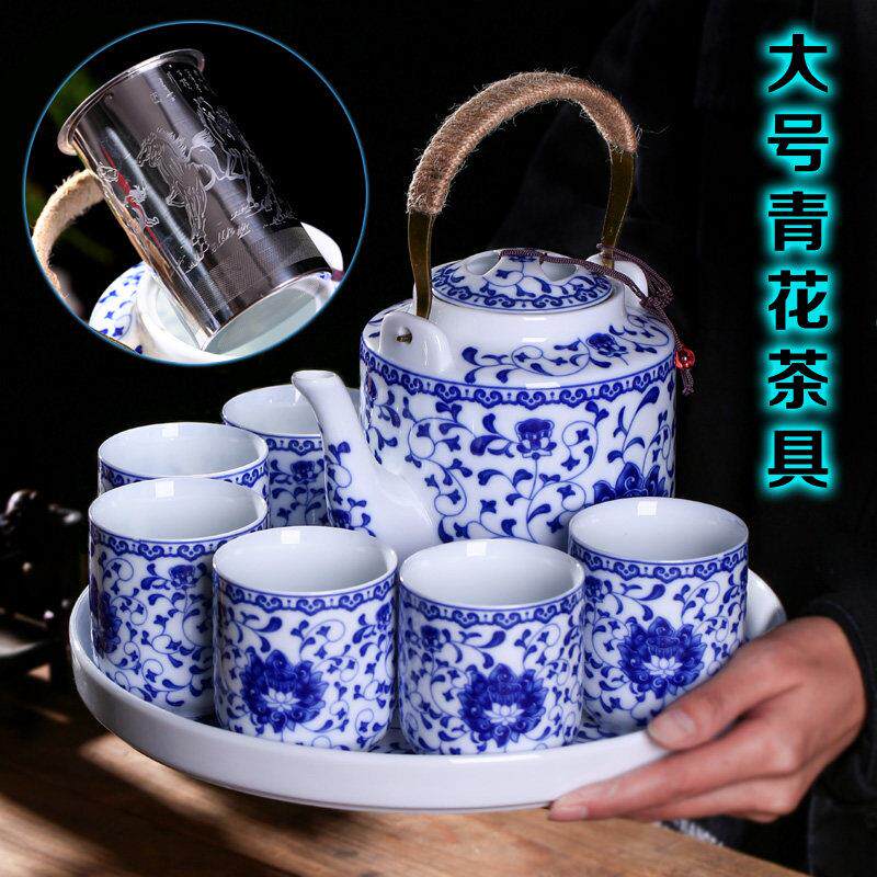 青花瓷景德镇陶瓷茶具套装提梁壶茶壶茶杯茶盘中式老式凉水壶大号
