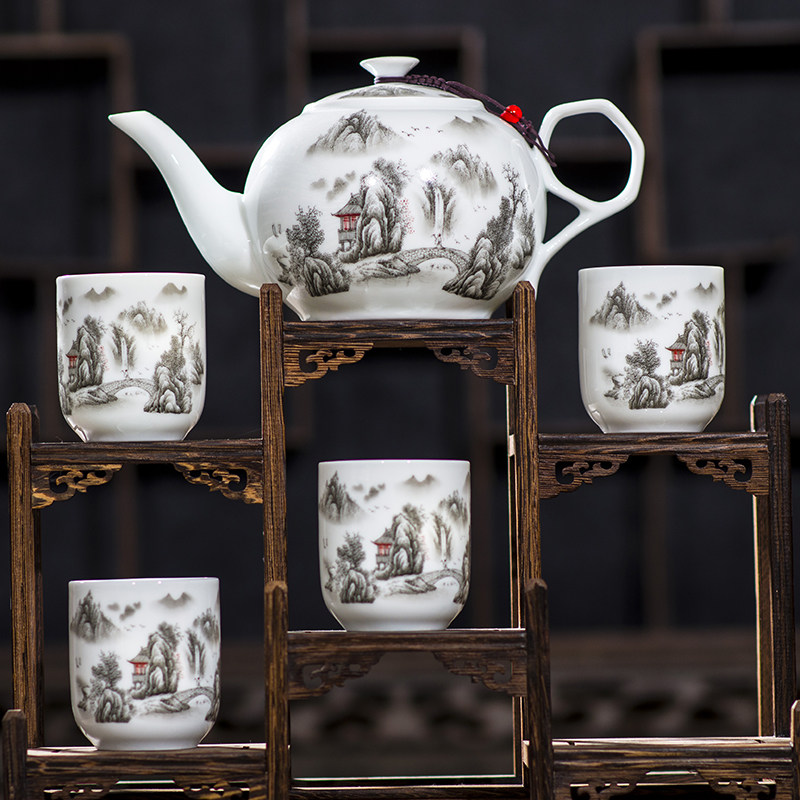 陶瓷大茶壶 大号单壶功夫茶具景德镇品茗杯小山水青花骨瓷泡茶壶
