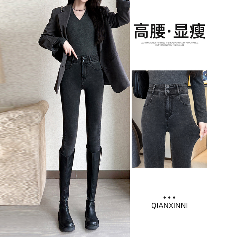 黑灰色加绒牛仔裤女2025年秋冬新款高腰显瘦修身紧身小脚铅笔裤子