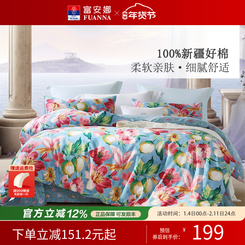 富安娜家纺100%纯棉四件套全棉被套床单被罩四季床上床品套件1.8m