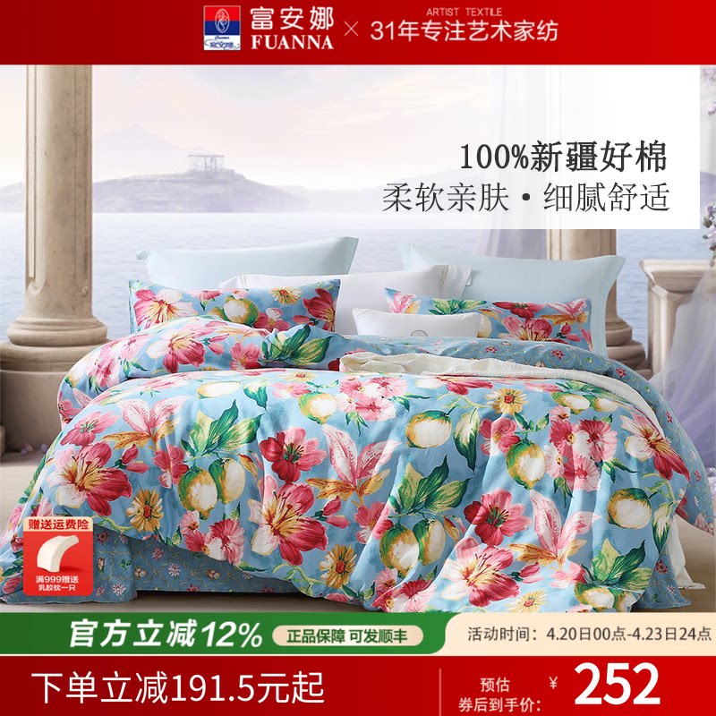 富安娜全棉纯棉四件套床单被套1.5米床1.8m床双人经典网红款4件套