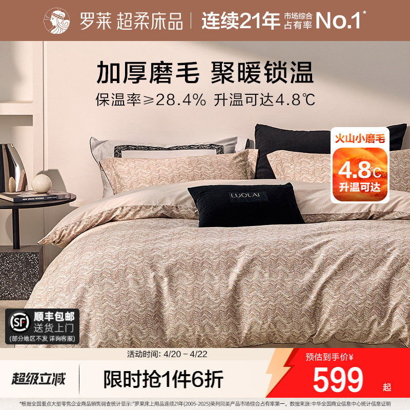 罗莱家纺全棉磨毛60支加厚纯棉床品双人1.8m床四件套床上用品