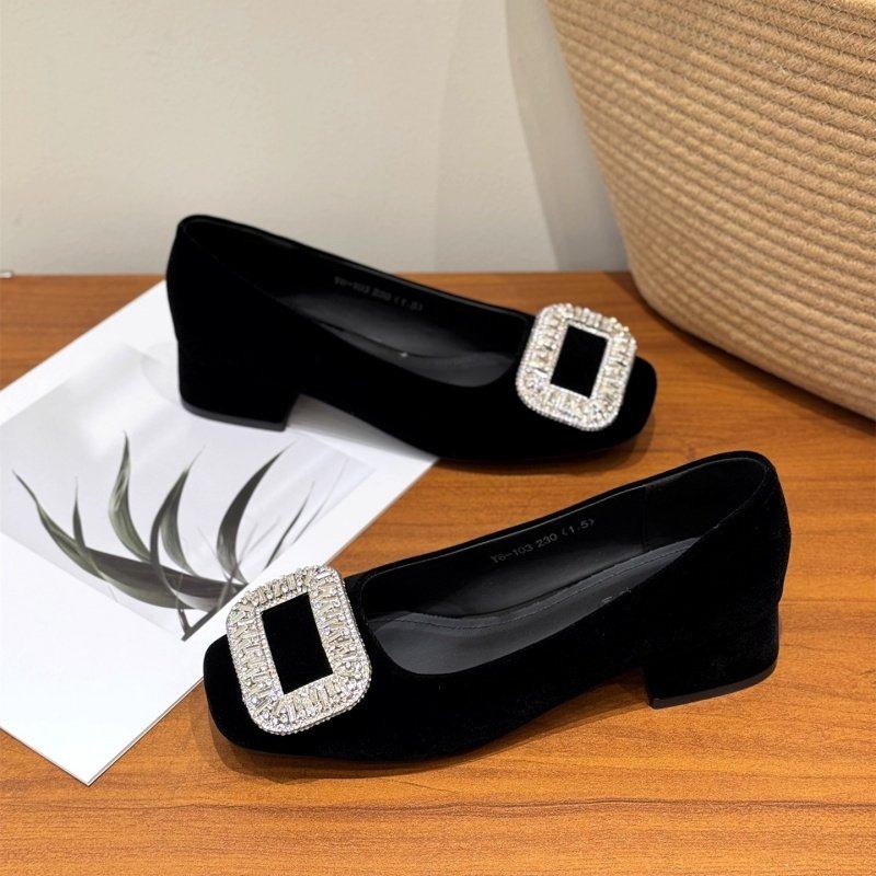 水钻方扣粗跟羊皮深口单鞋女2026春季时尚气质磨砂绒面中跟时装鞋