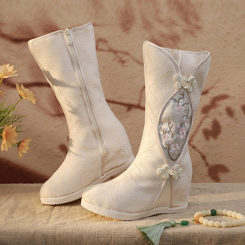 秋冬季内增高老北京布鞋女中筒汉服靴子高跟茶服舞鞋民族风绣花鞋