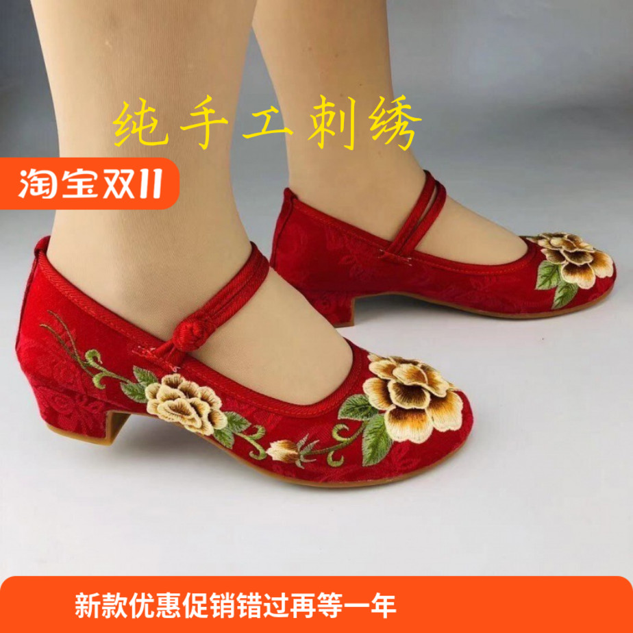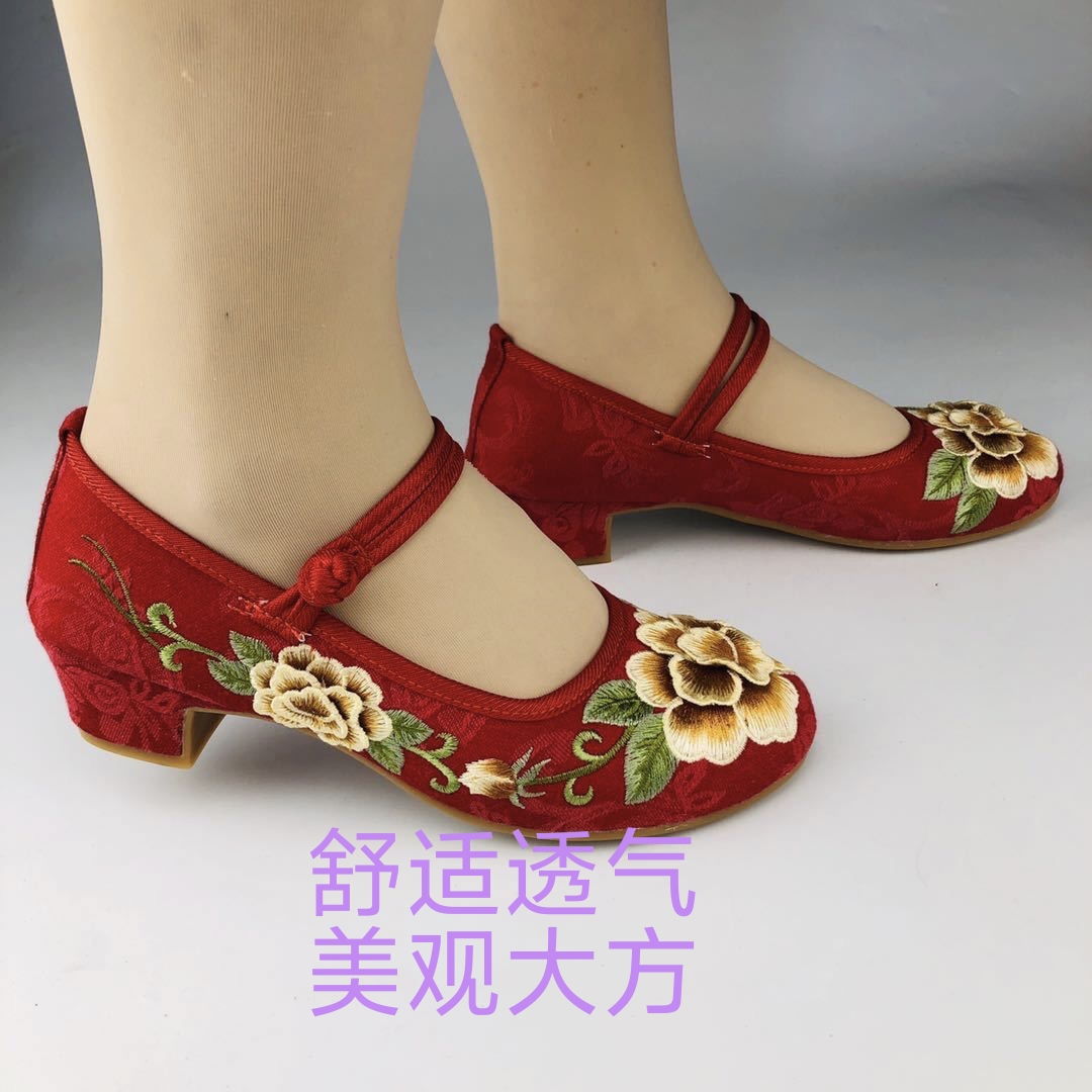 老北京绣花内增高布鞋女民族风单鞋春秋一字扣广场舞蹈表演演出鞋