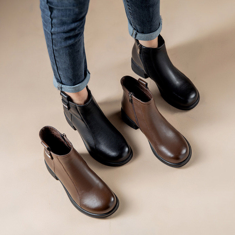 [明星同款]真皮软底妈妈靴女短靴棉鞋单靴粗跟女靴中跟中老年人马