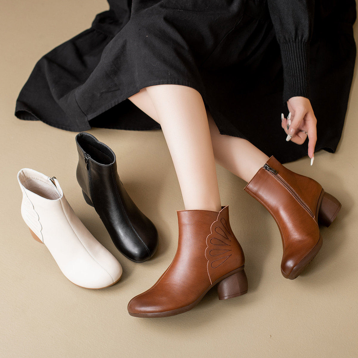 - 拉链平底短靴
