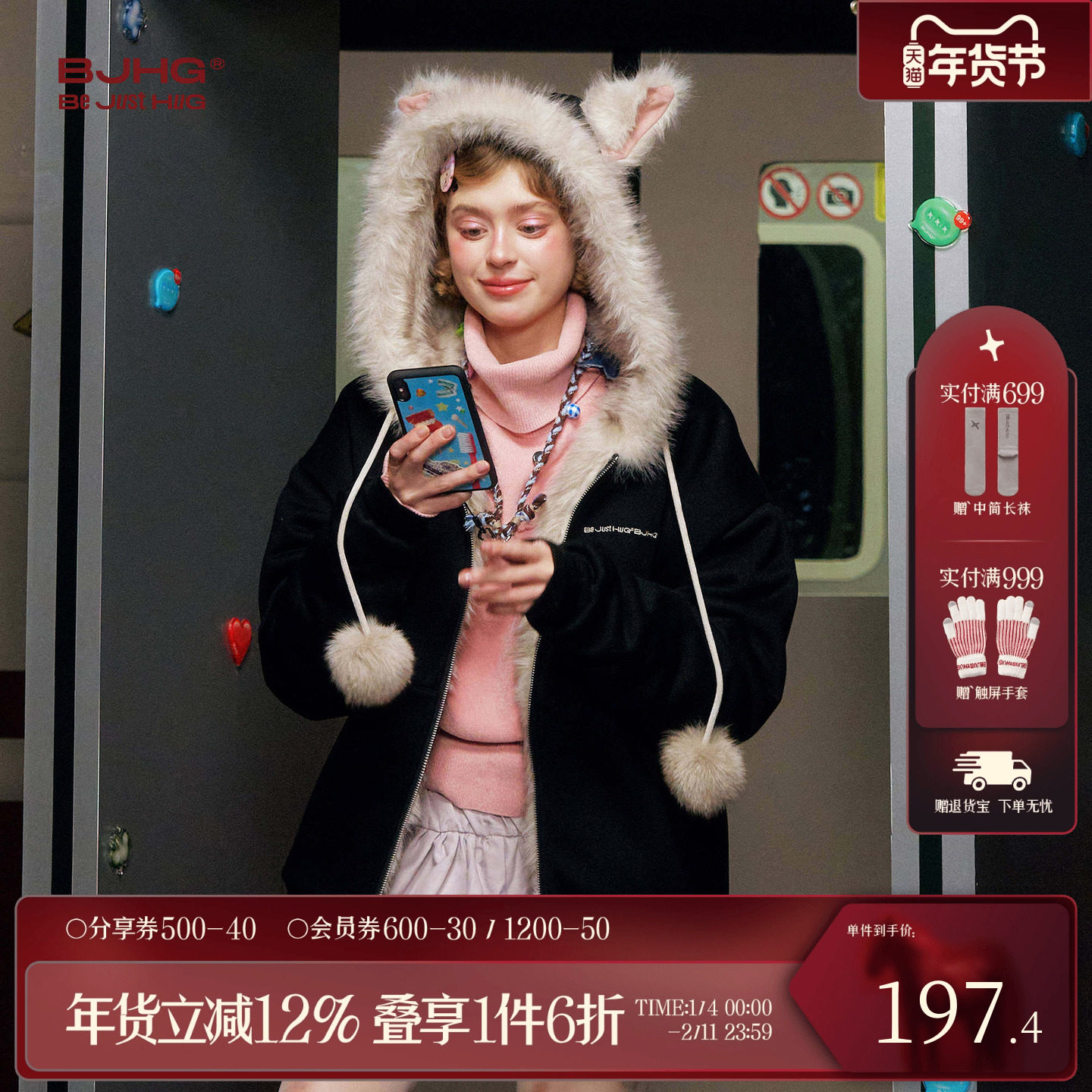 BJHG不计后果猫耳朵毛毛外套女款冬季短款加厚保暖连帽夹克座山雕
