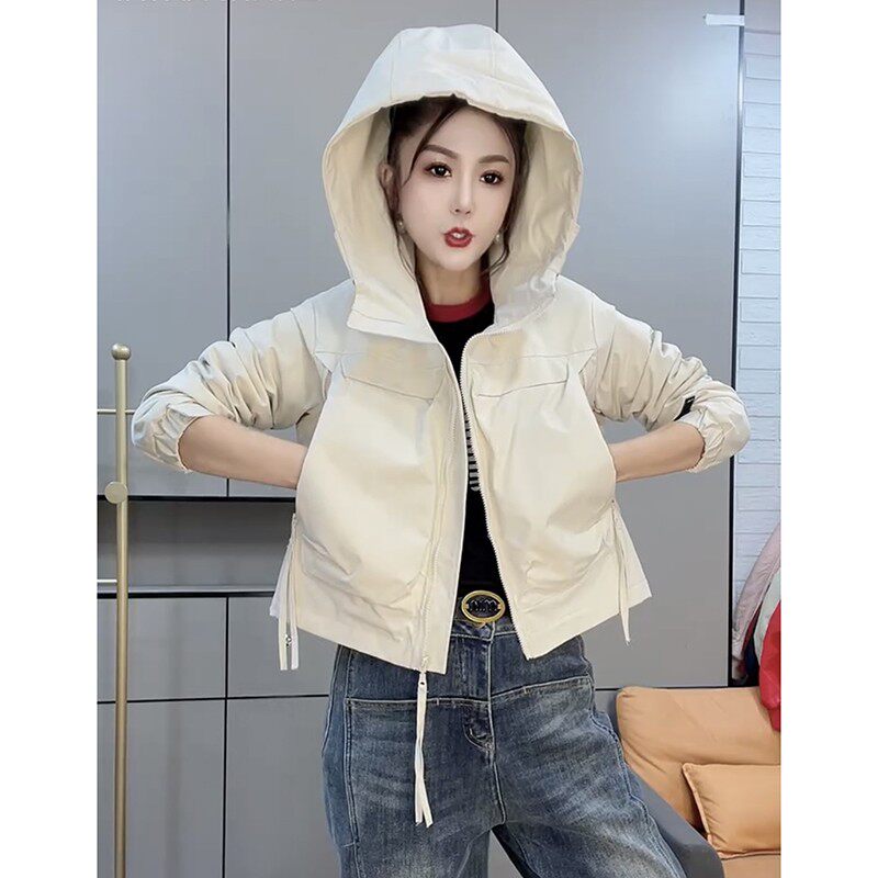 春秋季2025年新款薄款外套女短款纯色连帽小风衣防风挡雨夹克上衣