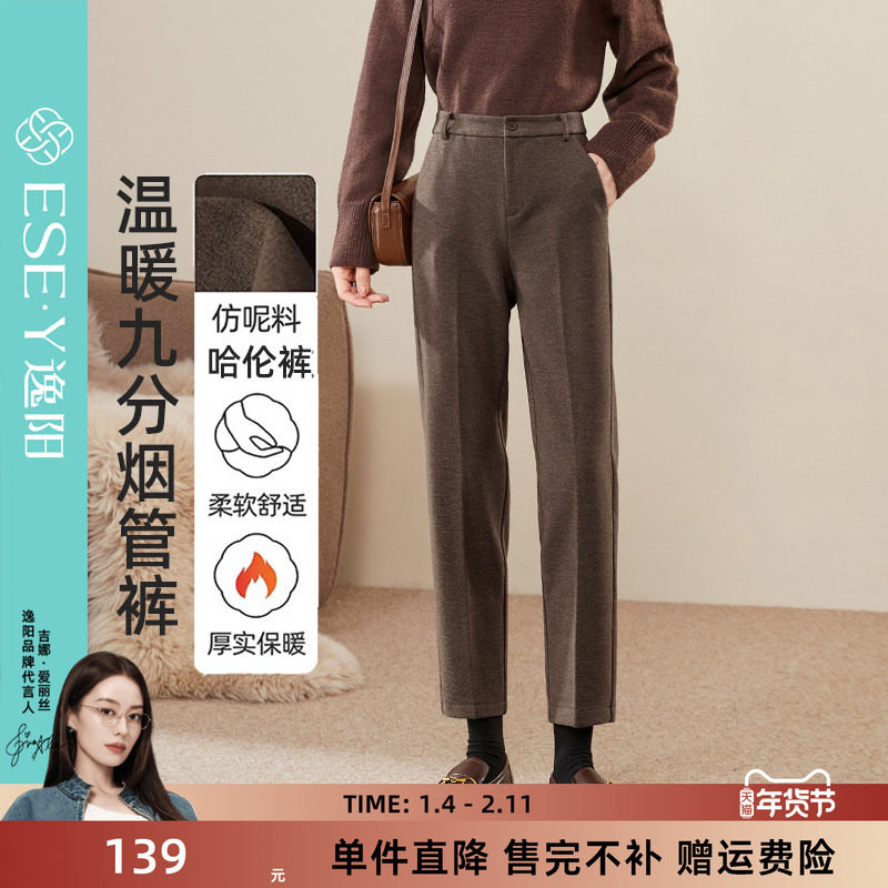 逸阳毛呢哈伦裤女冬季新款加厚咖色休闲九分小个子高腰直筒西装裤