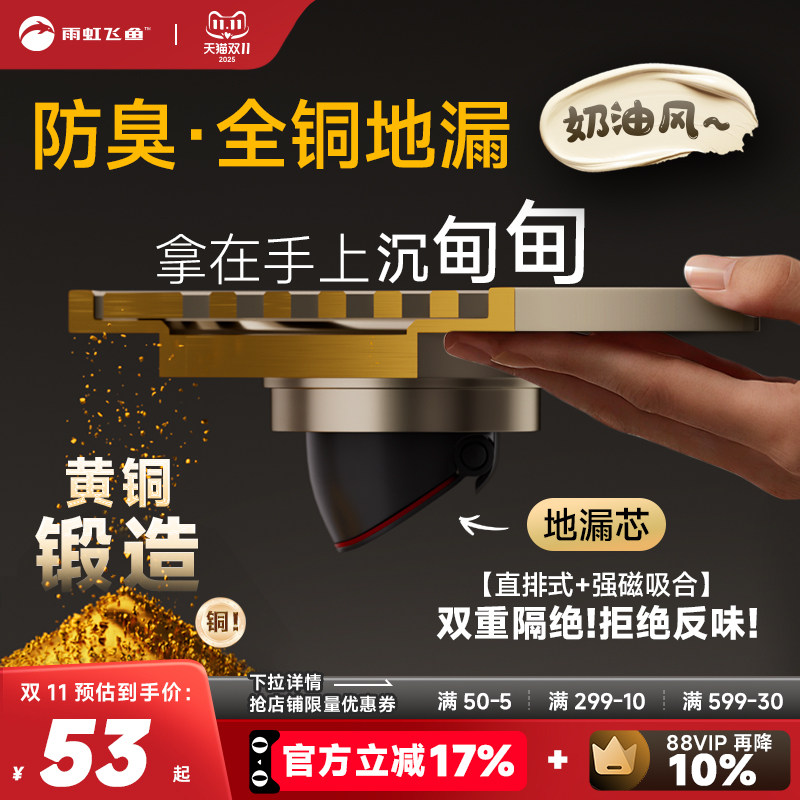 雨虹飞鱼全铜防臭地漏银色卫生间淋浴房通用洗衣机两用下水道神器