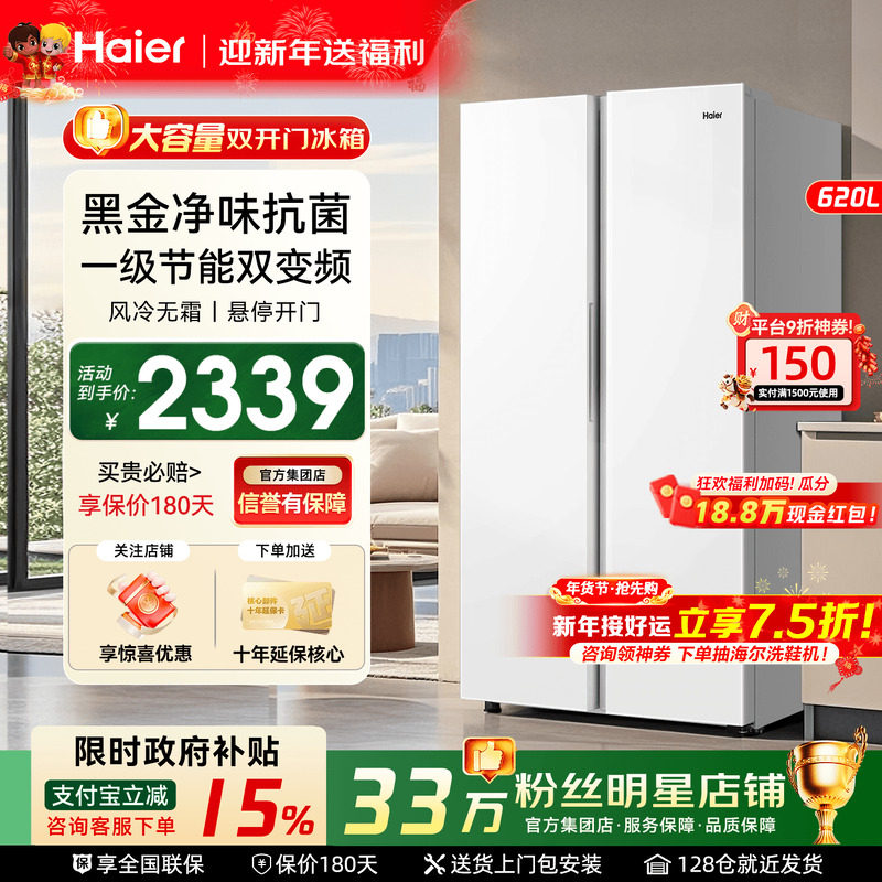 [政府补贴15%]海尔冰箱白色620L变频对开门双门无霜大容量旗舰店