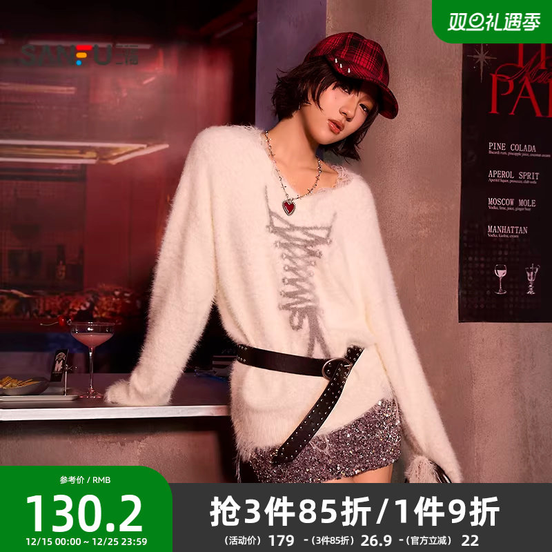 三福毛衣2025冬季绑带绣花设计破洞宽松个性上衣女装513636