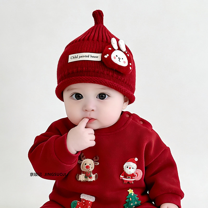 婴儿毛线帽冬季加厚红色奶嘴帽小月龄保暖针织套头帽宝宝圣诞帽潮