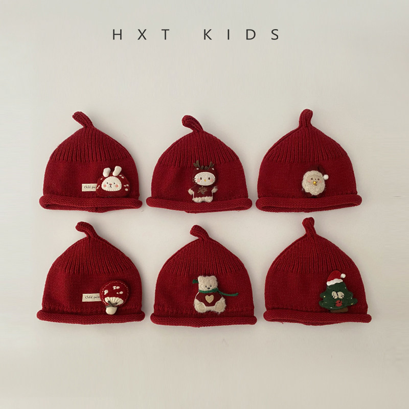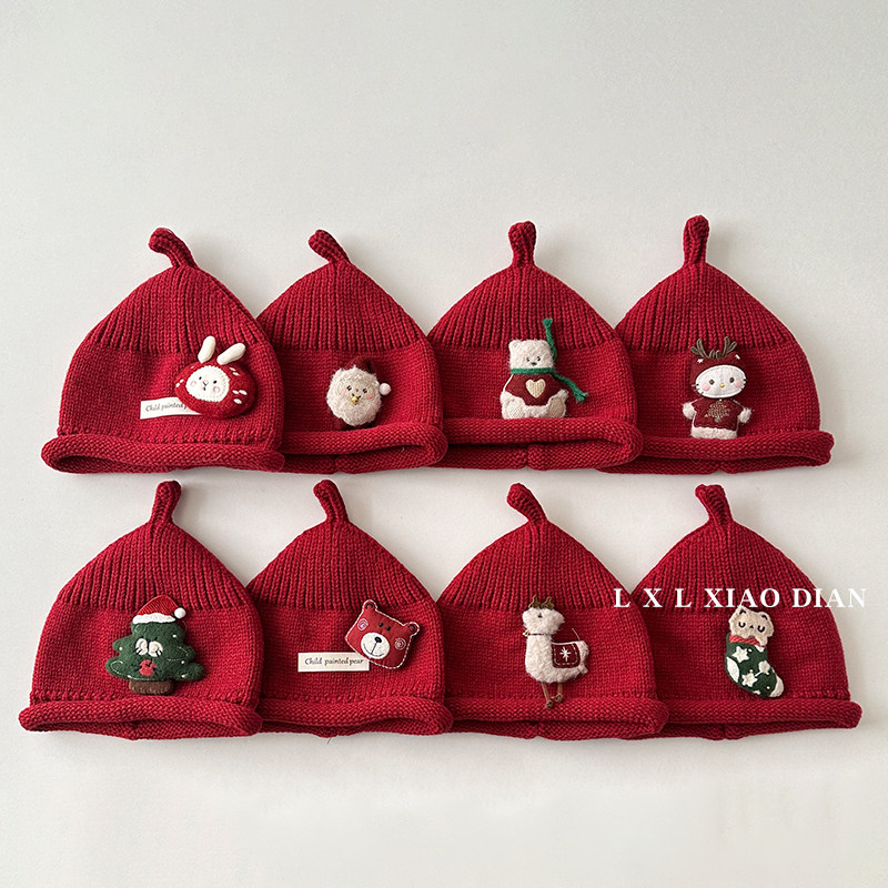 婴儿毛线帽秋冬季洋气红色奶嘴帽小月龄宝宝保暖套头圣诞针织帽冬